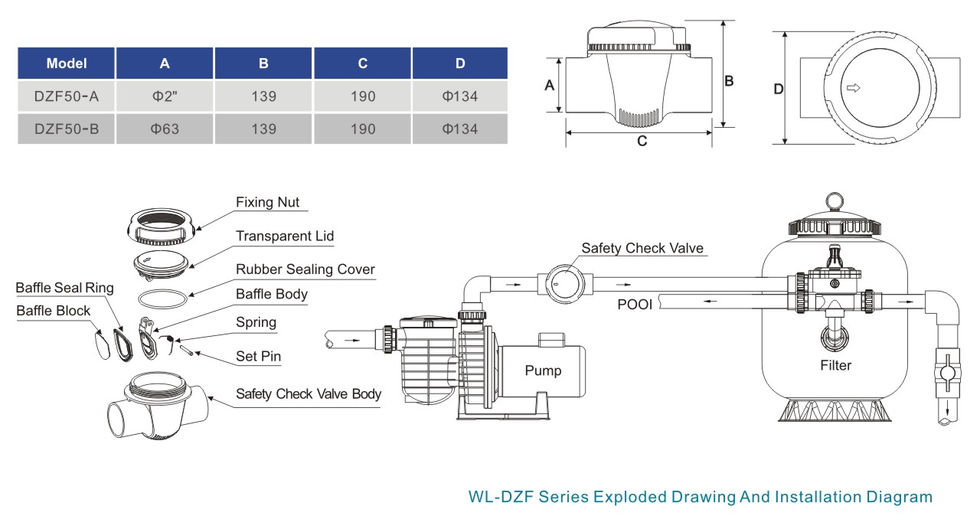 La válvula de seguridad es un accesorio esencial para la bomba de circulación. Su función principal es evitar daños en el impulsor cuando la bomba deja de funcionar. La válvula de seguridad LASWIM está especialmente diseñada para piscinas y spas y se basa en el flujo del líquido para activar y desactivar automáticamente el deflector de sellado, lo que determina la dirección del flujo del líquido. Garantiza la dirección del flujo de agua de la piscina y el spa y evita el reflujo.